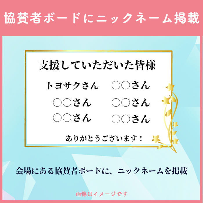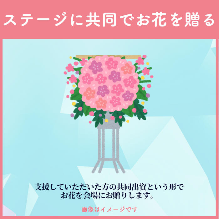協賛者ボードと、ステージのお花と一緒に、出演者で写真を撮影し、SNSでの広報に使用いたします。 -
