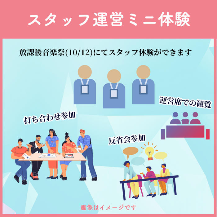 - 放課後音楽祭に運営スタッフとして当日ご参加いただけます。